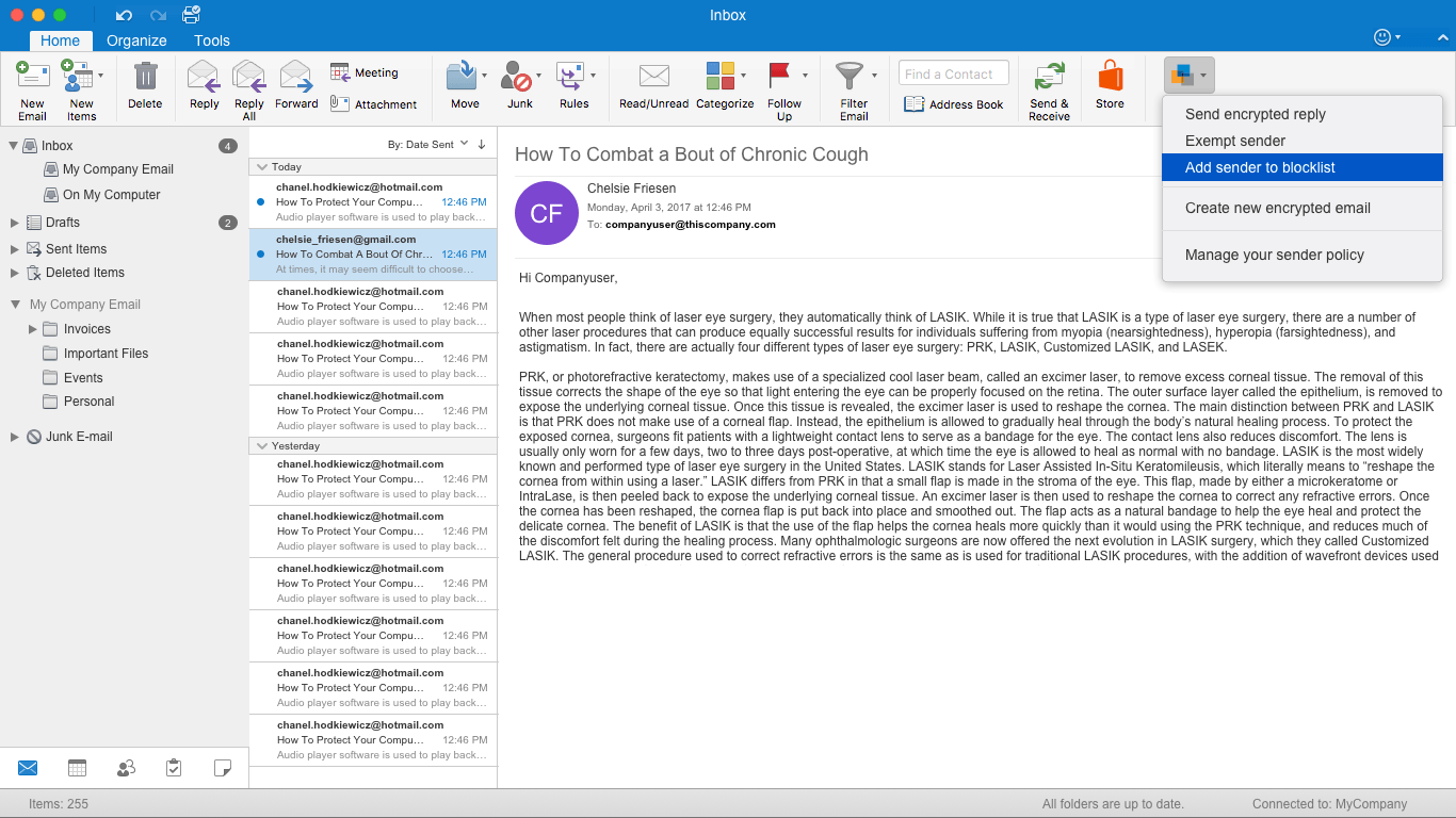 - You just got an e-mail that looks like a spam e-mail offering you medication at a very discounted rate. Report that e-mail as spam through the add-in.