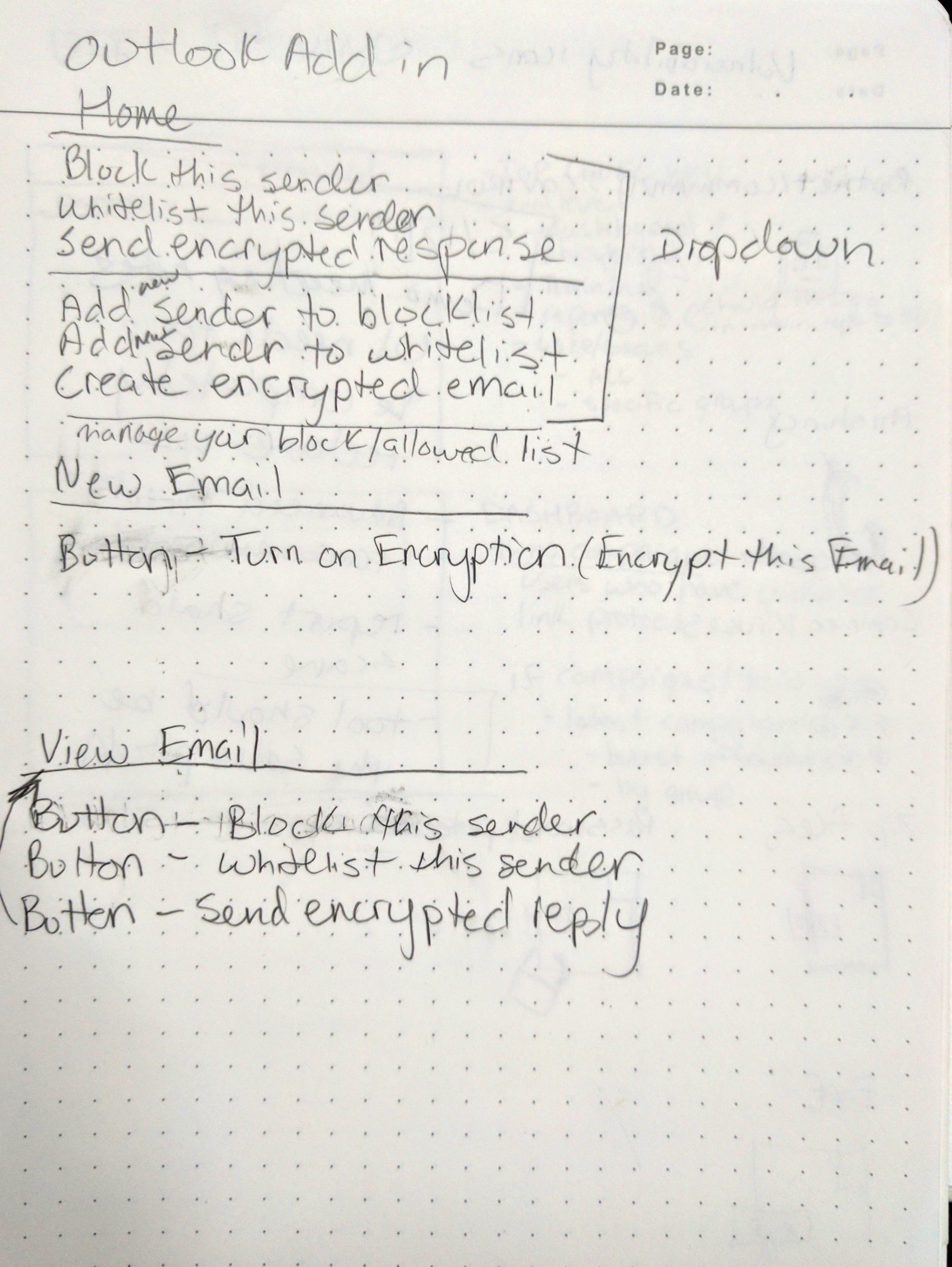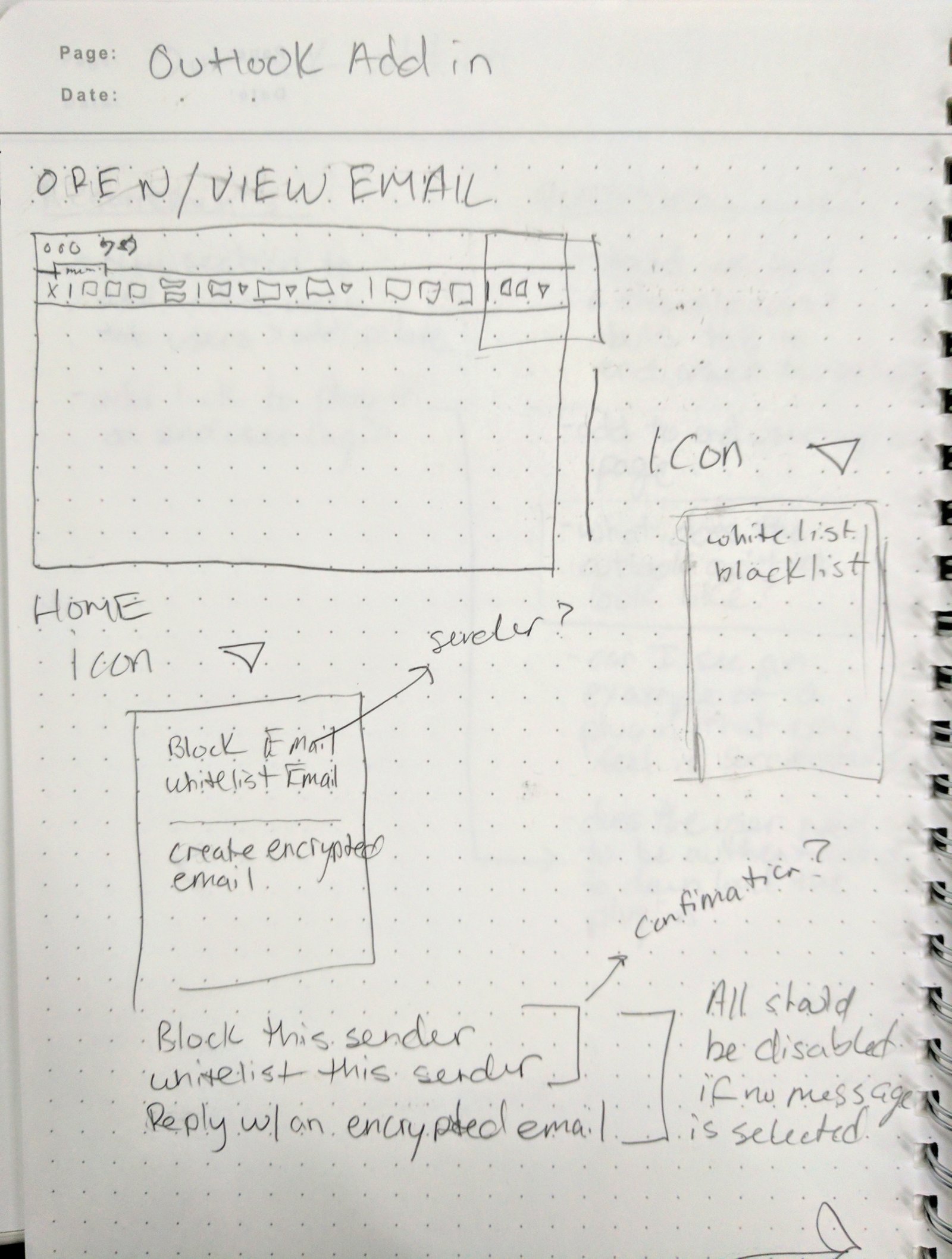 One of my theories for the initial design was to try and integrate the functionality in such a way that mimicked the Outlook interface. I felt that this was a good route to go, because end users were familiar with Microsoft’s products and patterns already. I tried to accomplish this with a dropdown when the Outlook Add-In button was clicked upon.